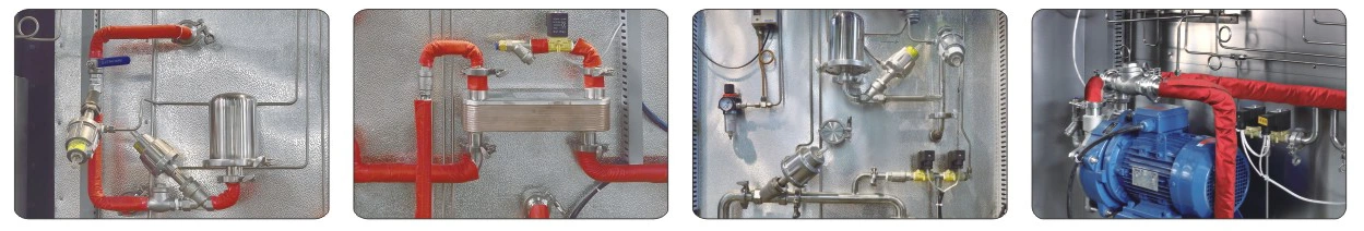 ● Rury sanitarne ze stali nierdzewnej 304 z połączeniami zaciskowymi. Przyjęcie zaworów pneumatycznych z gniazdem kątowym GEMU importowanych z Niemiec, zaworów elektromagnetycznych dostarczonych przez tajwańską firmę AirTAC i bezpośrednio podłączonej pompy próżniowej z pierścieniem wodnym importowanej z niemieckiego SPECK.